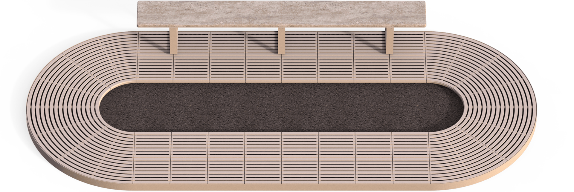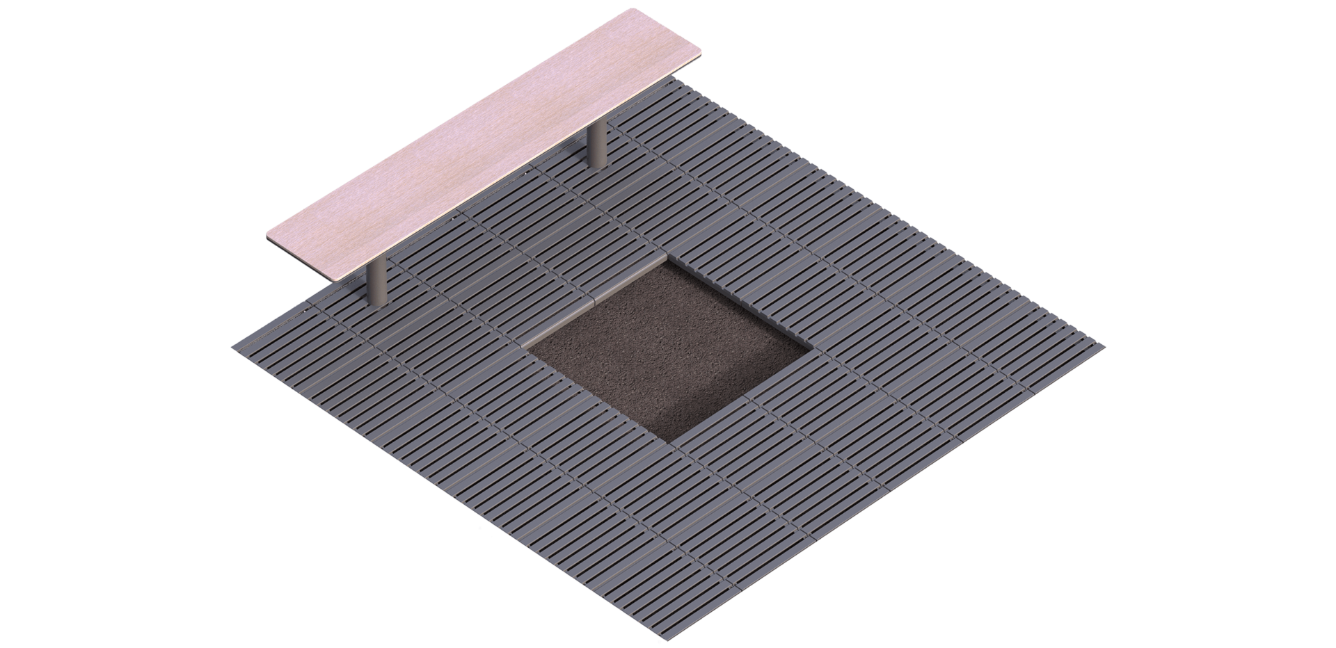 Systém mříží umožňuje sestavu lávek a pochozích ploch nad úrovní retenčního záhonu, díky tomu není snížený dešťový záhon bariérou ve veřejném prostoru, ale jeho funkční součástí.